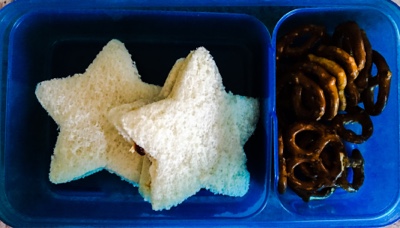 These are PB&J on white wheat star sandwiches. The side is pretzels.